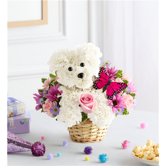 EXCLUSIVE Our truly original 3D pup is a precious Mother’s Day surprise. Crafted from white carnations, with sweet pink blooms all around and a butterfly accent, this canine creation is designed in a dog bed basket. For more happy wishes, add our festive “Happy Mother’s Day” balloon.